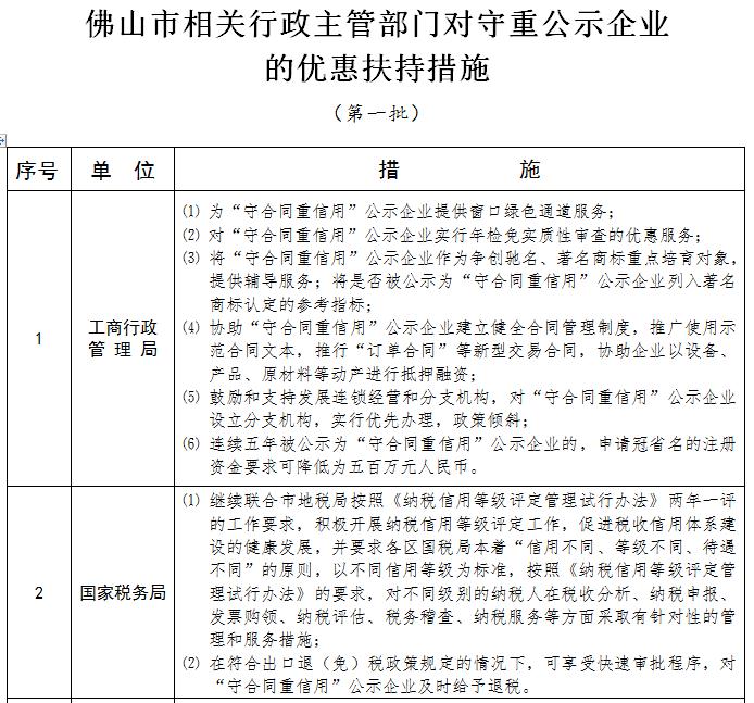 佛山市相關(guān)行政主管部門對守重公示企業(yè)的優(yōu)惠扶持措施(第一部分)