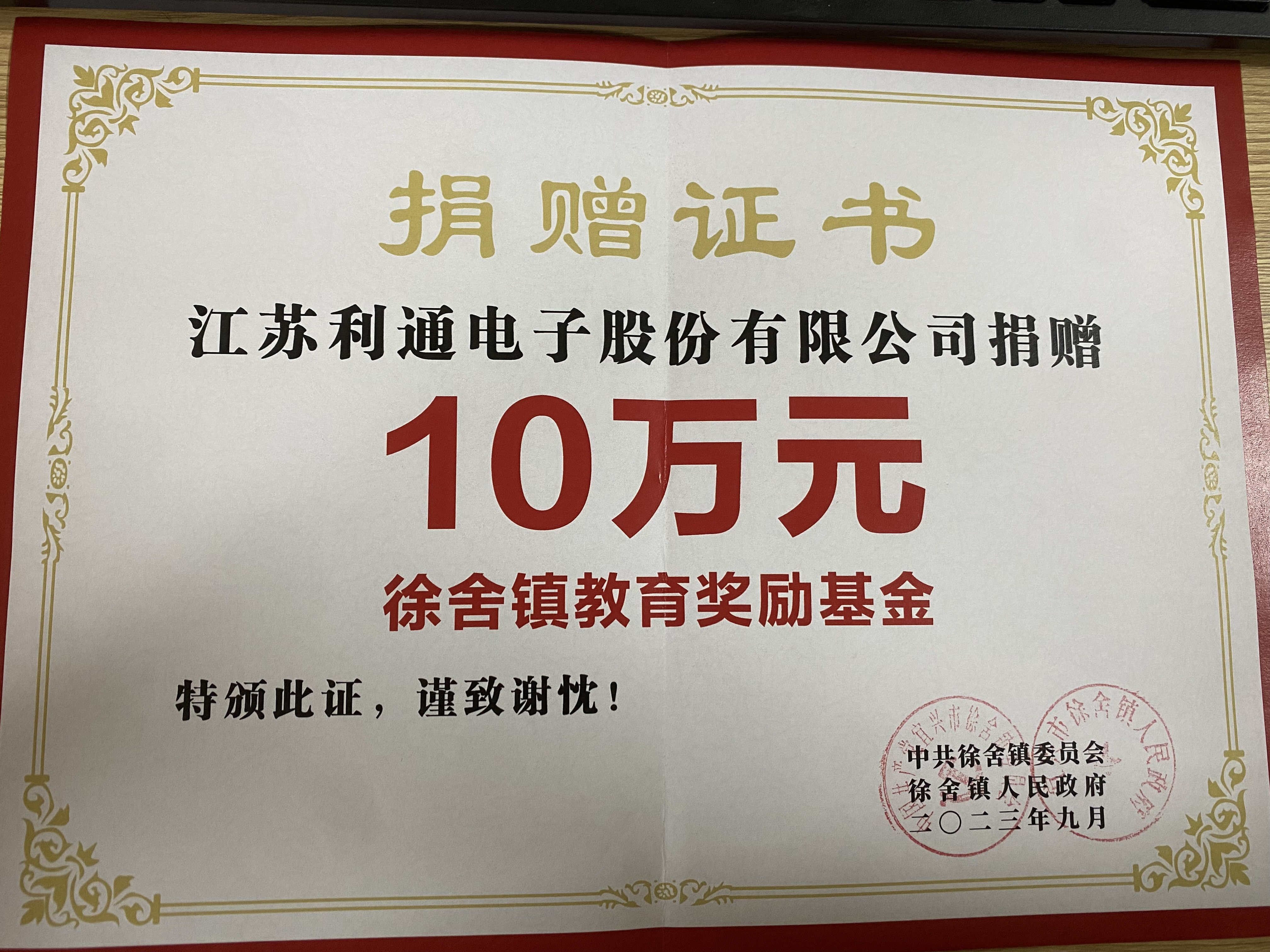 2023年9月8日上午,徐舍鎮(zhèn)隆重召開慶祝第三十九個教師節(jié)暨2023年度教育工作會議。利通電子認捐10萬元,支持徐舍鎮(zhèn)教育事業(yè)的高質(zhì)量發(fā)展。我司作為慈善捐贈愛心企業(yè)受邀參加此次會議。利通一直樹立以人為本的企業(yè)文化,在關(guān)注自身發(fā)展的同時,也用實際行動踐行著企業(yè)的社會責(zé)任,積極倡導(dǎo)愛心公益,情系教育,心系發(fā)展,為教育事業(yè)貢獻自己的一份力量。